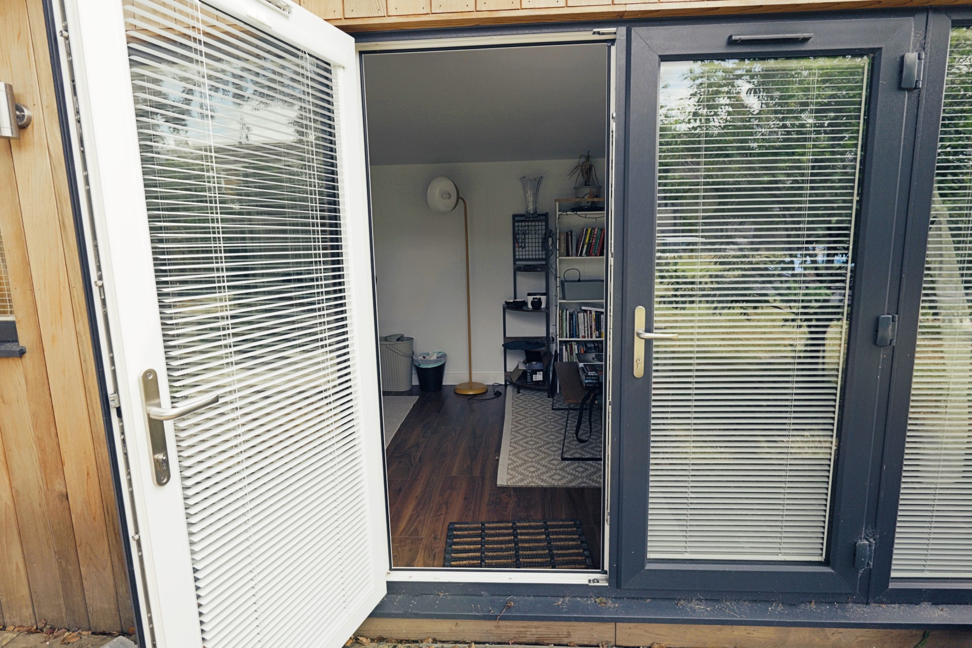 That left Rob with still a fairly large studio area of 6m x 3m to combine as a garden office, creative space and music area. In any garden building light is always a key consideration, and Rob decided to complete his studio with a set of 3.6m French doors with sidelights, and an additional fixed window on the front elevation.